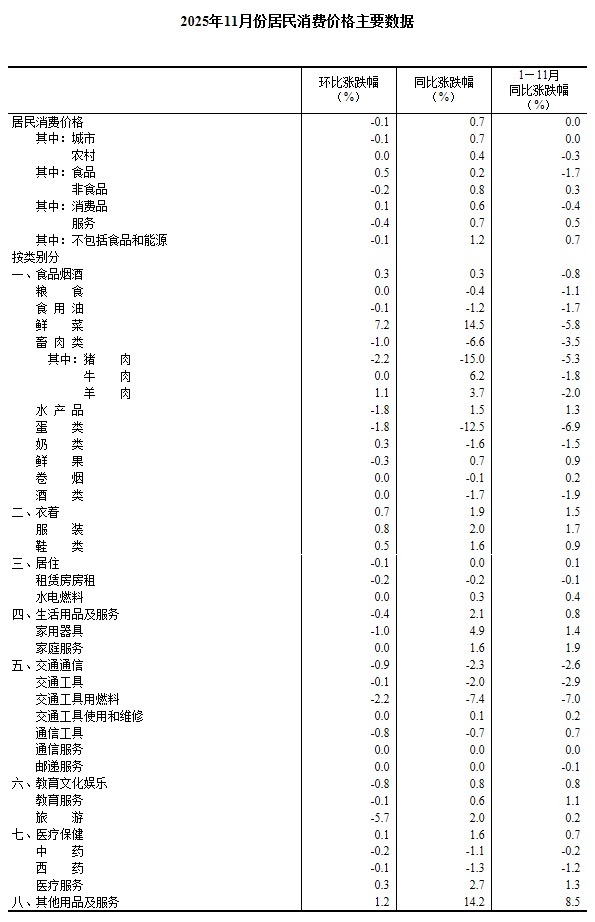 东谈主民网北京12月10电 (记者杨曦)国度统计局10日发布数据披露,2025年11月份,宇宙住户破钞价钱同比飞腾0.7%。其中,城市飞腾0.7%,农村飞腾0.4%;食物价钱飞腾0.2%,非食物价钱飞腾0.8%;破钞品价钱飞腾0.6%,做事价钱飞腾0.7%。1—11月平均,宇宙住户破钞价钱与上年同时握平。